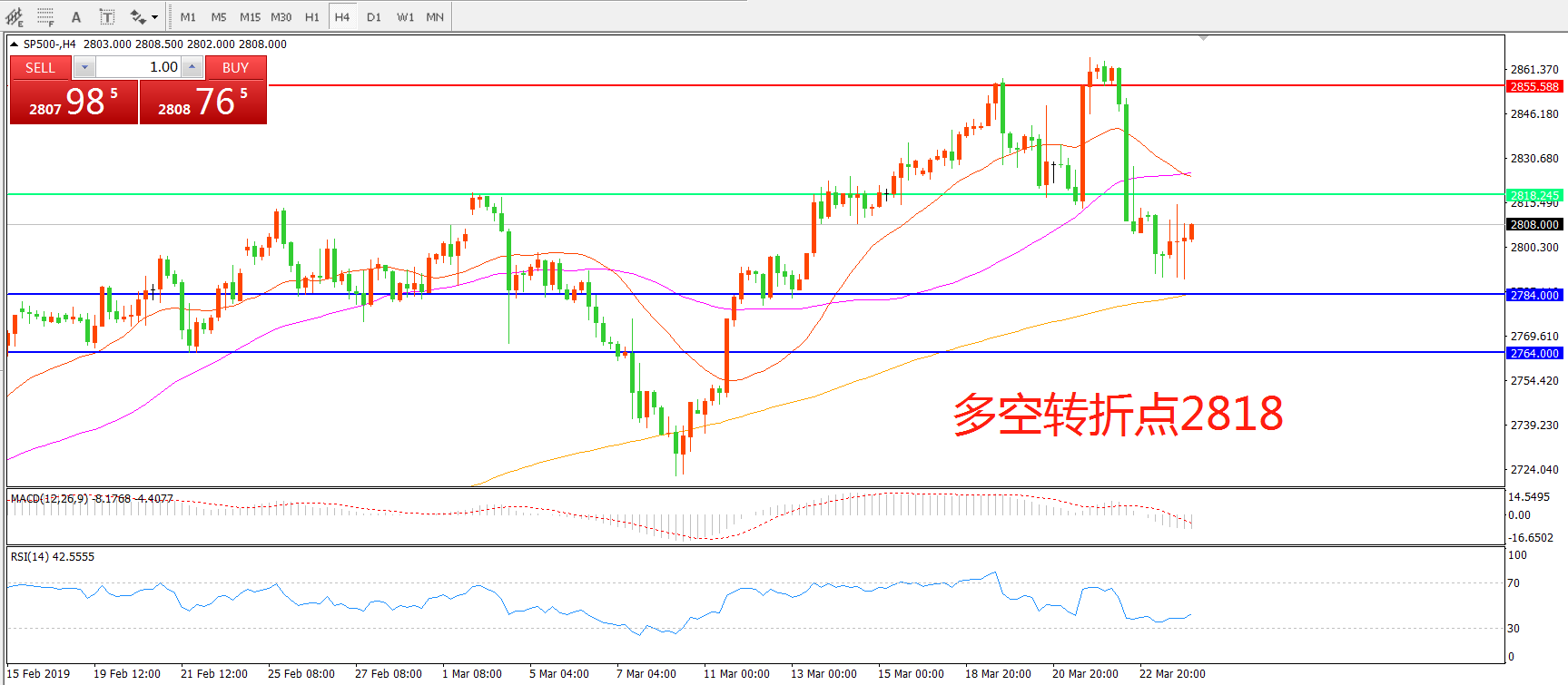 4小时图看,标普500在突破2855后快速回落, 长阴下破后击穿2818支撑,目前在200附近企稳,但短期均线形成死叉,MACD红柱增加,RSI拐头向上,日内震荡下行概率较大。