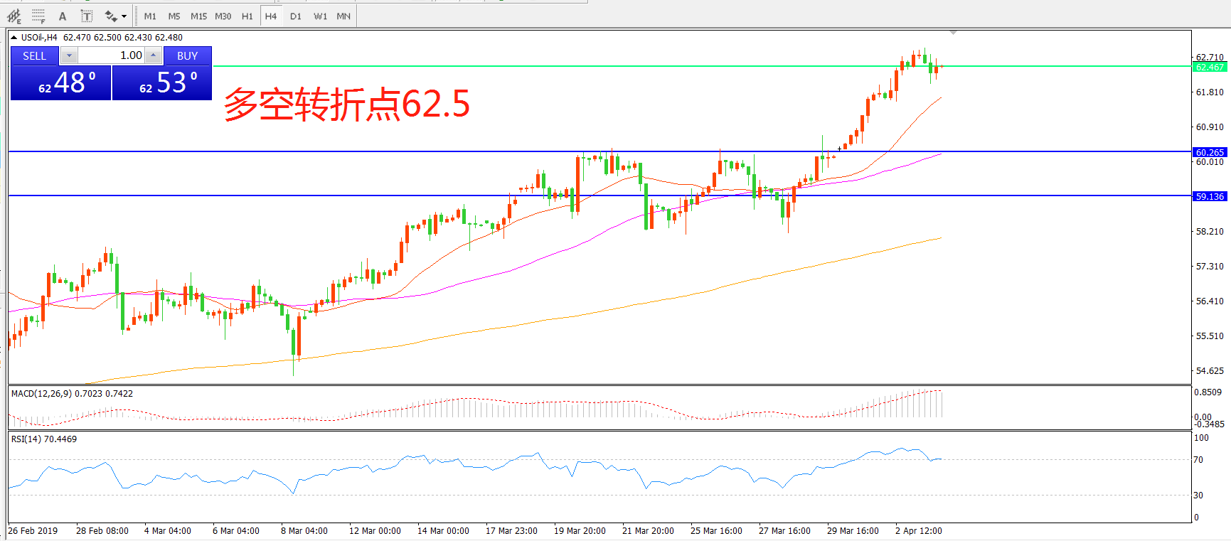 4小时图看,油价以均线系统为依托企稳上升,虽然价格出现小幅回落,但短期走势依然偏强。均线系统呈多头排列,MACD红柱增加,RSI指标走平,62.5美元一线再次成为多空分水岭