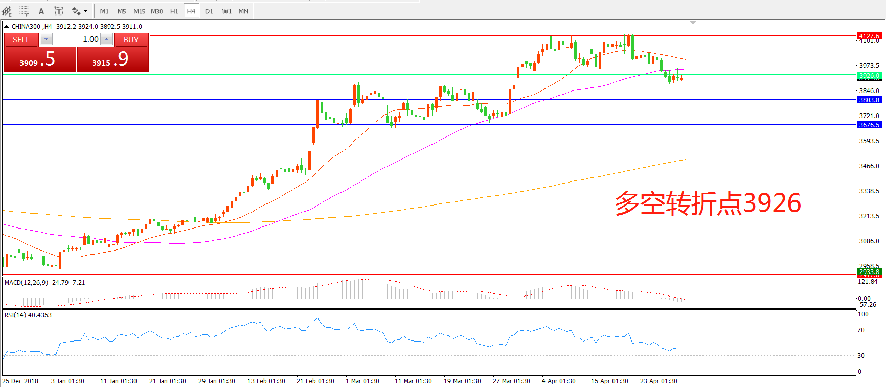 4小时图看,沪深300指数一路震荡下行,21均线有下穿形成死叉迹象,MACD红柱减少,RSI指标走平,重点关注3926一线得失。