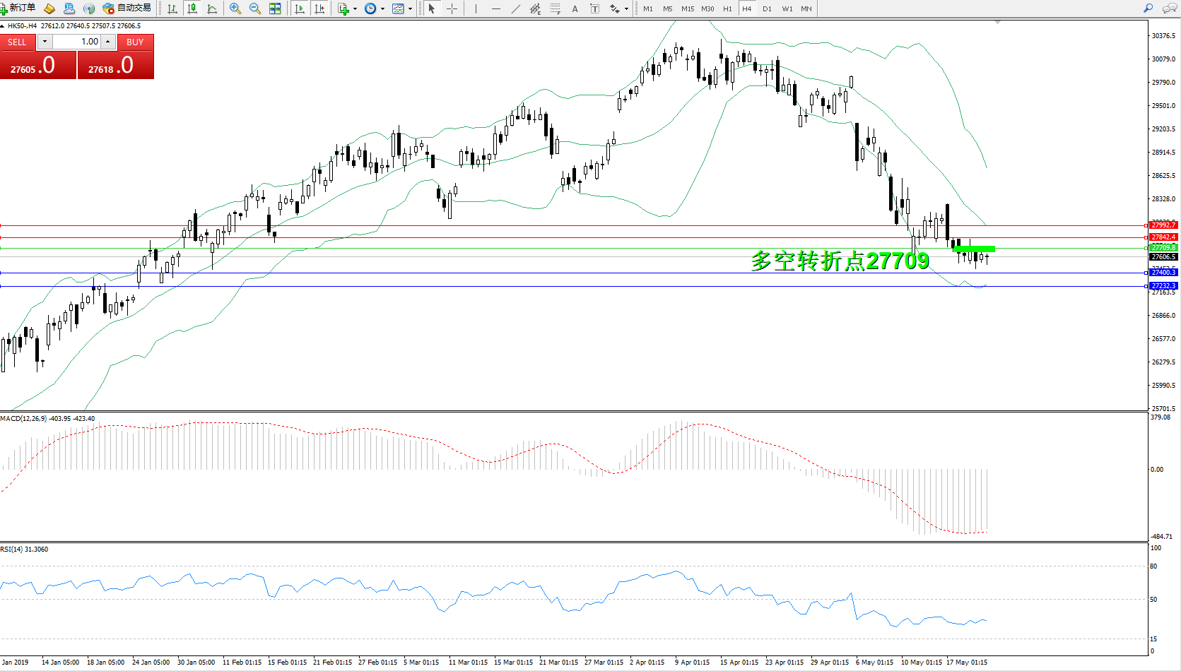中国内地股市早盘盘初冲高回落,随后持续震荡走低。截至收盘,上证综指跌0.49%,收于2891.70点;香港恒生指数全天在平盘线上方震荡,截至收盘涨0.18%,报27705.93点。。现外围美股收跌令港股承压,市场担忧两国贸易关系恶化给企业带来冲击,港股做多动力匮乏,因此,料港股短期震荡筑底。据悉美国拟把海康威视等5家中国企业纳入出口管制名单。贸易争端继续抑制市场情绪,美国拟把更多中国企业加入出口管制名单。
