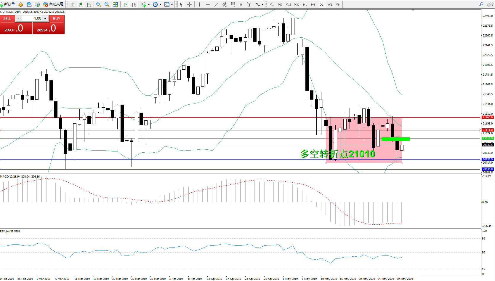 日经指数周四收跌至三个半月低点,市场愈发担忧中美贸易战迟迟不能解决将打击经济。日经指数N225收跌0.29%至20,942点,为2月中旬以来最低收位。盘中稍早,日经指数一度下跌0.92%至20,809点,接近5月14日的日内低点20,751点。如果在这个水平附近反弹,可能形成双重底部,或许支撑市场,如果跌破那个水准,将推动日经指数跌至2月中旬以来最低位,料进一步冲击已然疲弱的市场人气。