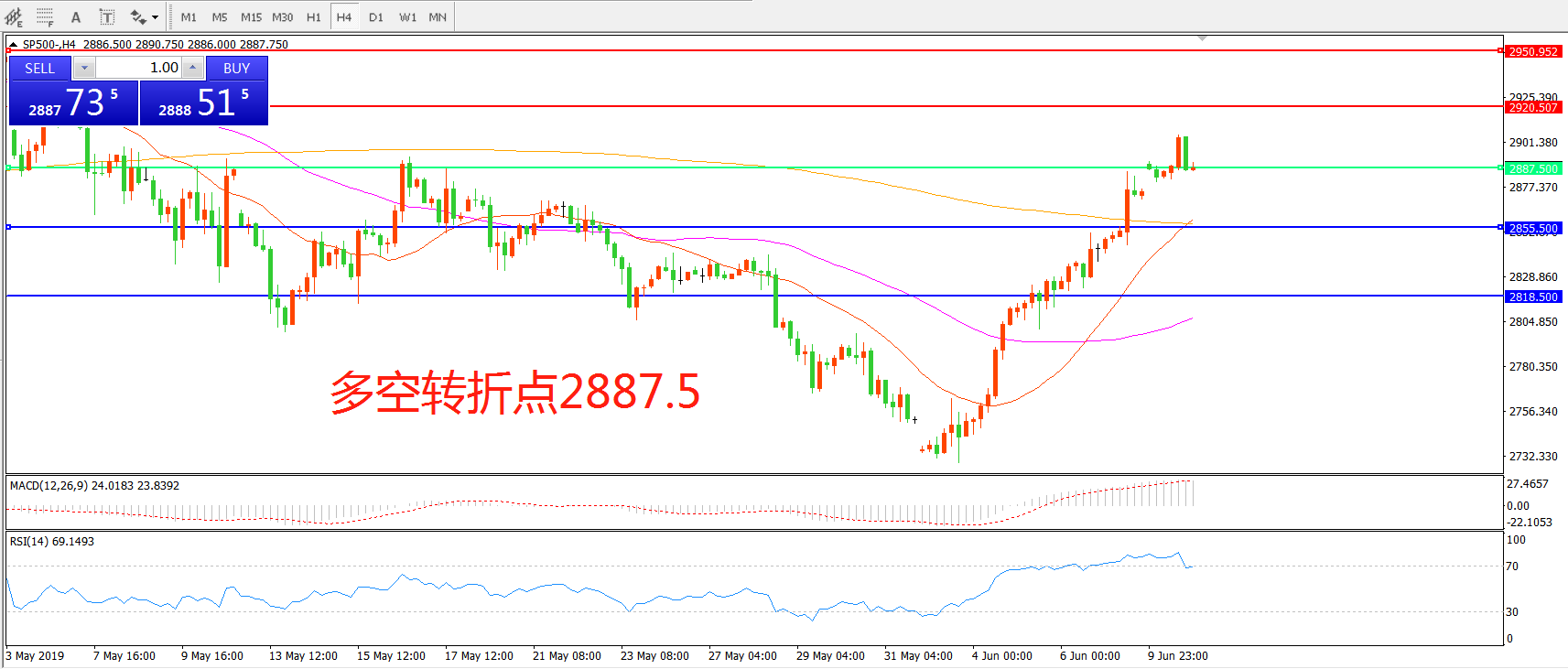 4小时图看,标普高位反弹后,阴线吞没大部分涨幅, 2887.5成为短期争夺焦点,短期均线走平,MACD红柱增加,RSI指标走平,日内以高位震荡思路对待。