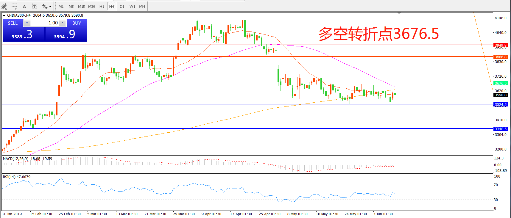 交易策略:在3676.50之下看跌,目标3524.50     3348.50