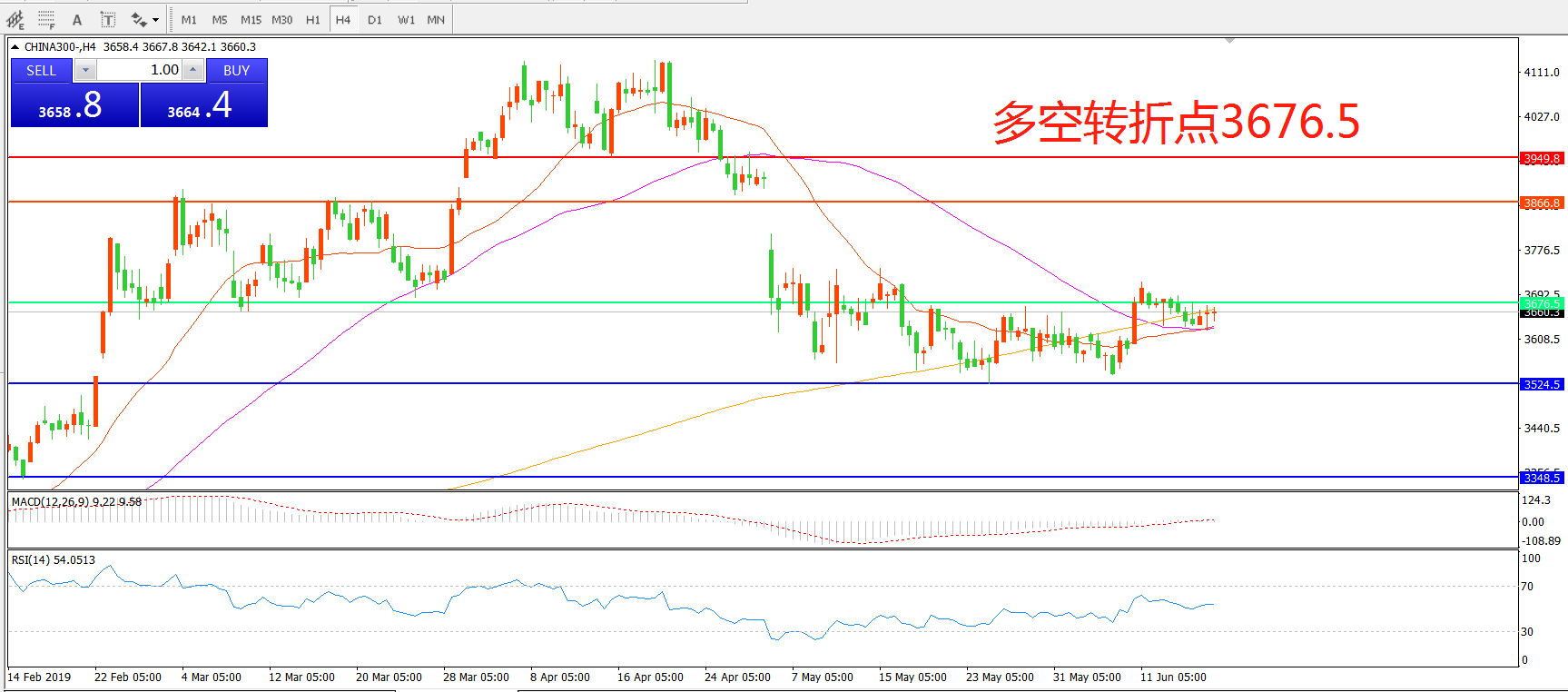 4小时图看,沪深300指数冲高回落,依然维持3676.5一线整理,整体方向仍然偏空,均线系统粘合形成下方支撑,MACD绿柱缩短,RSI指标拐头向下,日内延续震荡概率较大。