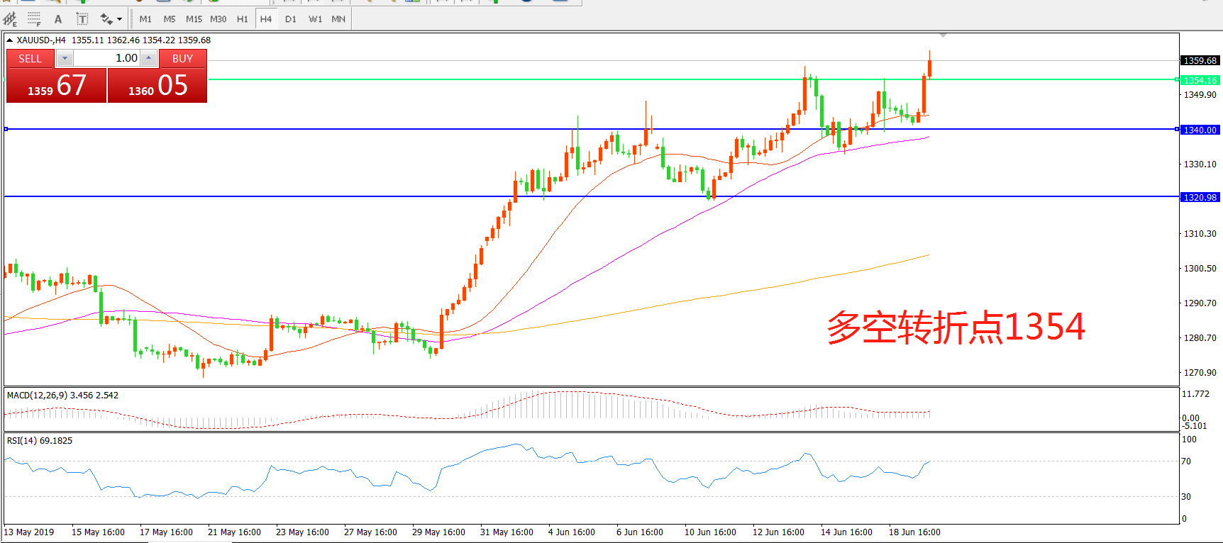 周三(6月19日)美联储宣布维持2.25-2.50%的利率不变,但在决议中内容明显转鸽,放弃了之前的声明中对未来的政策调整保持“耐心”的措辞,还称未来经济前景不确定性增加,消息公布后, 美元指数短线下跌20余点,现货金价短线飙升10美元,最终收报1359.23美元/盎司,创14个月来新高。