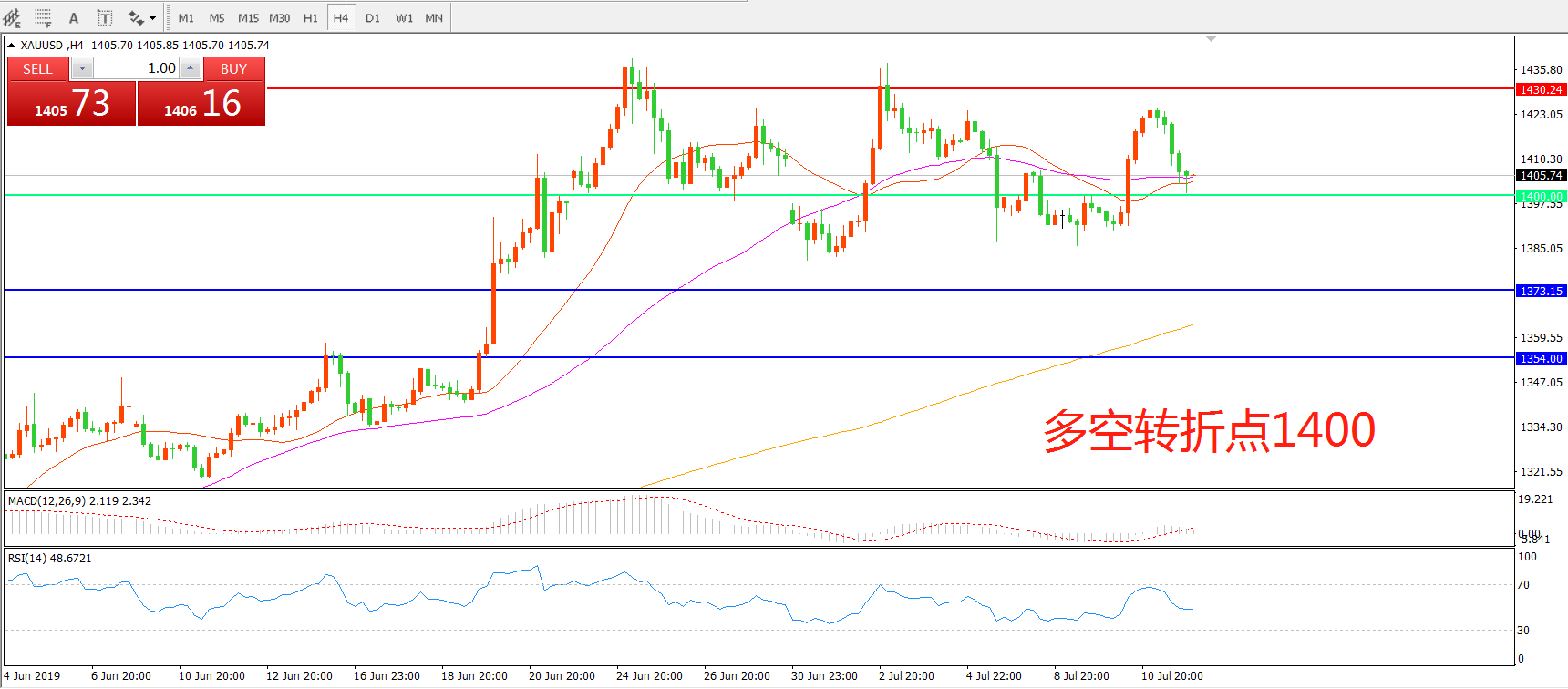 周四(7月11日)美市盘中,美国最新出炉的6月核心CPI月率上涨0.3%,创下一年半以来最大增幅。与此同时,美国初请失业金人数也表现强劲,好于预期及前值。美元指数短线加速上涨30点至97关口上方, 现货黄金则急跌近20美元,至1410美元/盎司下方,最终收报1404.83美元/盎司。但整体来看金价还处在相对强势的走势中,鲍威尔周三的国会证词已经给金价的强势走向定下了基调。