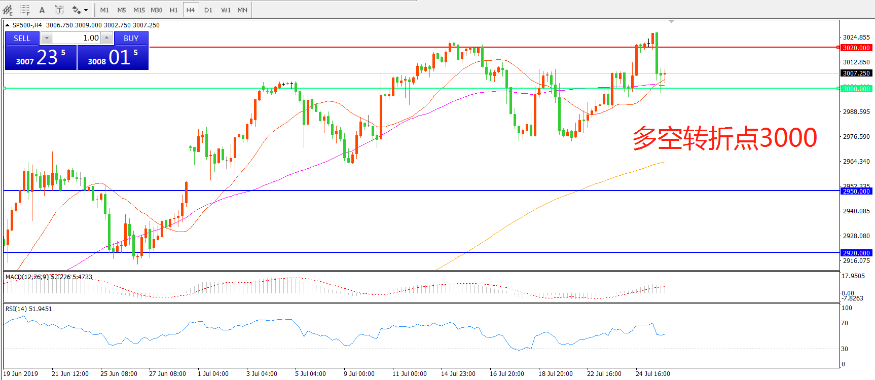 随着越来越多的公司报告业绩,美国上市公司第二季度财报状况已显示出持续恶化迹象,三年来首次出现盈利衰退的可能性已越来越大。标普500昨日冲高后掉头大跌,最终收报3006.75点。美国大型科技股多数收跌,苹果跌0.79%,亚马逊跌1.35% ,中概股多数收跌,阿里巴巴跌0.77%,京东跌1.15%,百度跌1.64%。欧洲央行宣布维持三大利率不变,但调整了前瞻指引,预计将保持现有关键利率水平不变或者更低水平至少至2020年上半年。