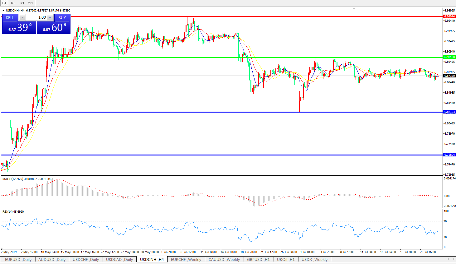 交易策略: 在6.9010之下,看跌,目标价位为6.8210,然后为6.7580。