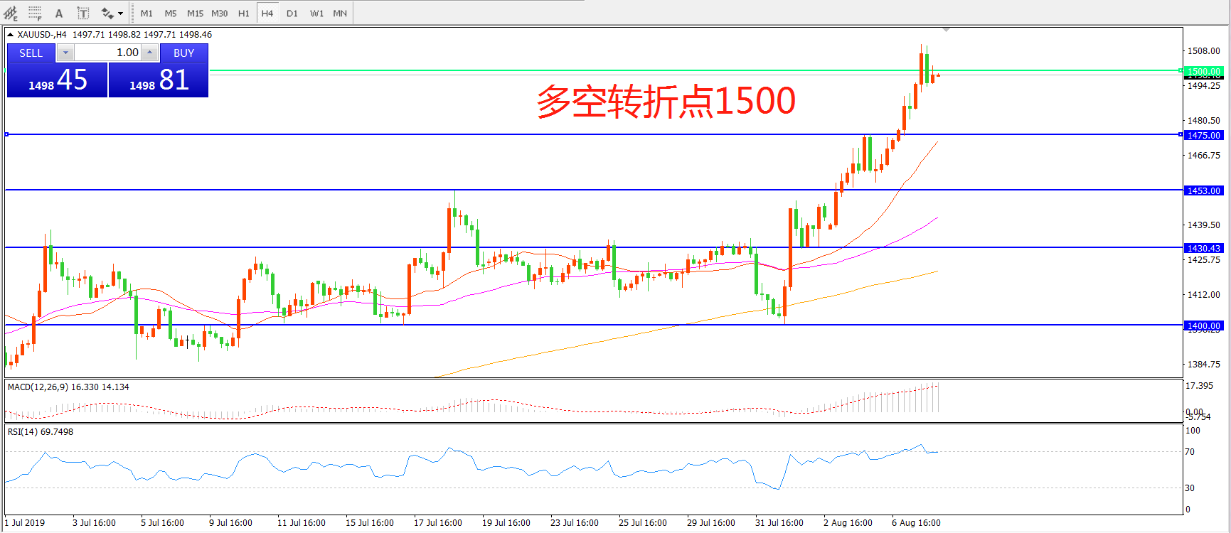 4小时图看,金价长阳连续拉升,整体表现强势,1500关口成为短期多空分水岭,均线系统呈多头排列,MACD红柱增加,RSI指标向上,中期走势仍然偏多。
