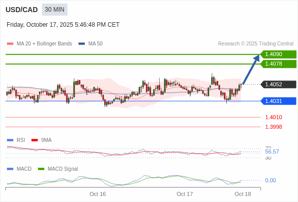 美元/加元 当日内 : 看涨,当 1.4031 为支撑位。