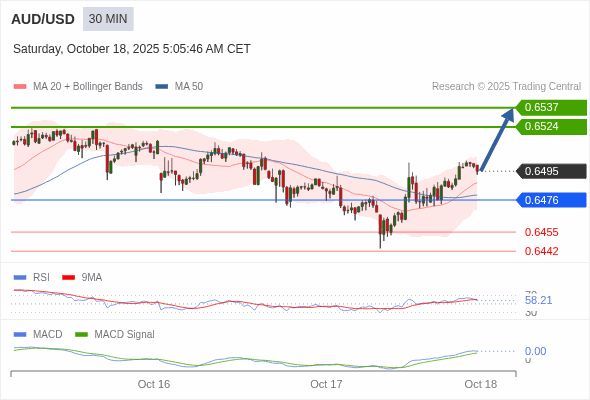 澳元/美元 当日内 : 看涨,当 0.6476 为支撑位。