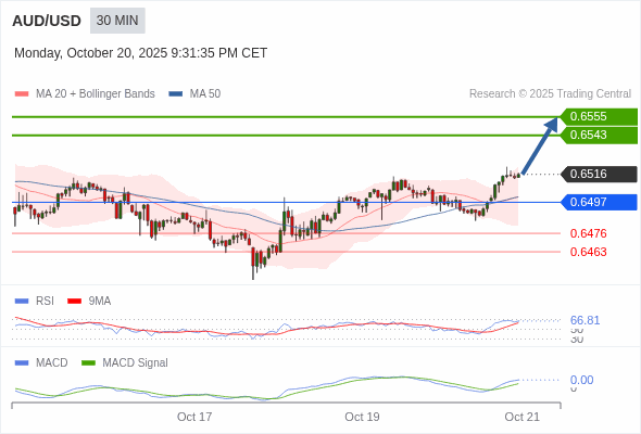 澳元/美元 当日内 : 看涨,当 0.6497 为支撑位。