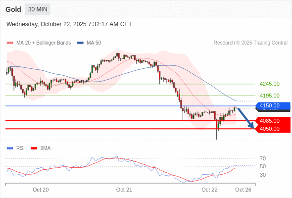在 4150.00 之下,看跌,目标价位为 4085.00 ,然后为 4050.00 。