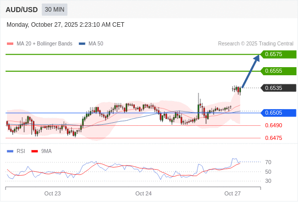 在 0.6505 之上,看涨,目标价位为 0.6555 ,然后为 0.6575 。