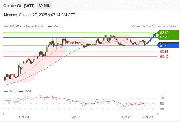 在 61.40 之上,看涨,目标价位为 62.20 ,然后为 62.60 。