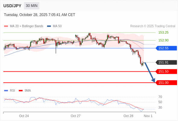 在 152.55 之下,看跌,目标价位为 151.50 ,然后为 151.00 。