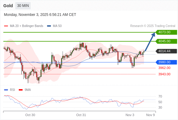 在 3980.00 之上,看涨,目标价位为 4045.00 ,然后为 4073.00 。