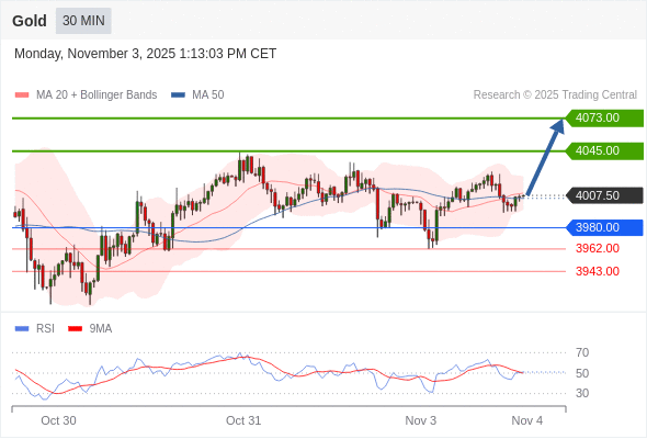 在 3980.00 之上,看涨,目标价位为 4045.00 ,然后为 4073.00 。