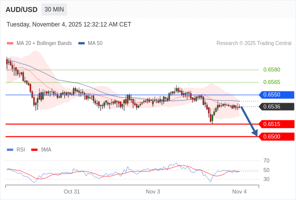 在 0.6550 之下,看跌,目标价位为 0.6515 ,然后为 0.6500 。