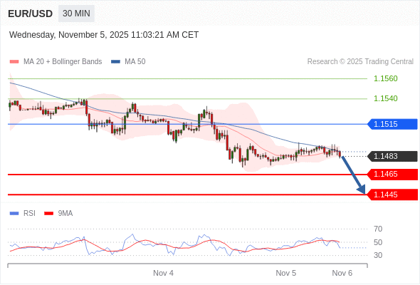 在 1.1515 之下,看跌,目标价位为 1.1465 ,然后为 1.1445 。