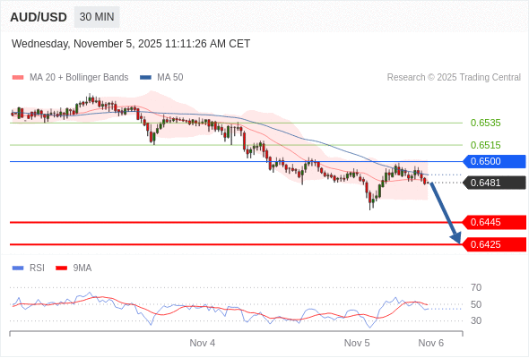 在 0.6500 之下,看跌,目标价位为 0.6445 ,然后为 0.6425 。