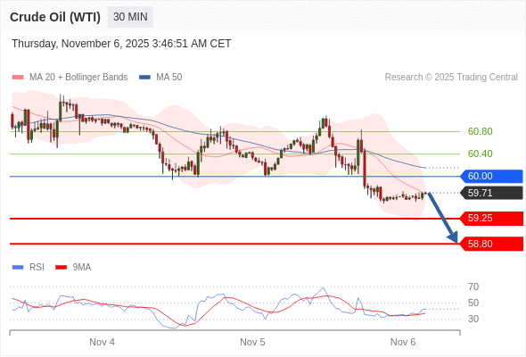 在 60.00 之下,看跌,目标价位为 59.25 ,然后为 58.80 。