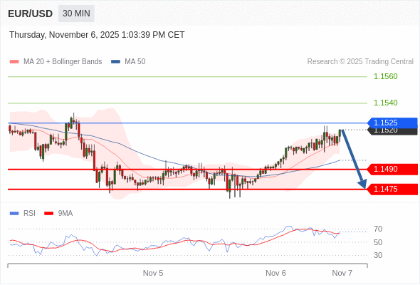交易策略: 在 1.1525 之下,看跌,目标价位为 1.1490 ,然后为 1.1475 。