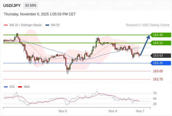 在 153.35 之上,看涨,目标价位为 154.10 ,然后为 154.40 。