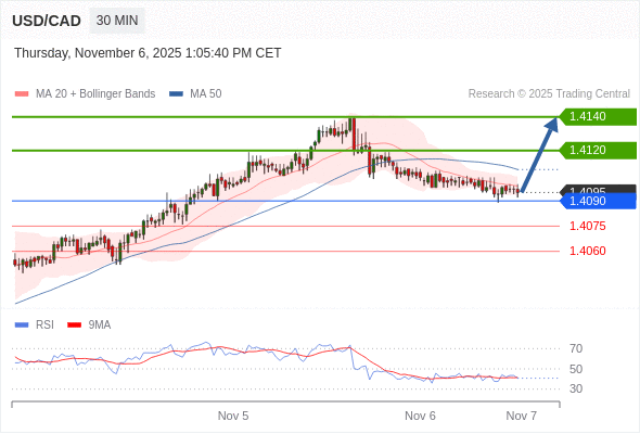 在 1.4090 之上,看涨,目标价位为 1.4120 ,然后为 1.4140 。