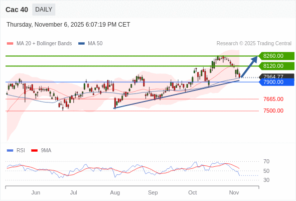 Cac 40 短线: 被上升趋势线支撑。