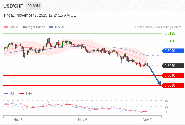 在 0.8090 之下,看跌,目标价位为 0.8040 ,然后为 0.8020 。