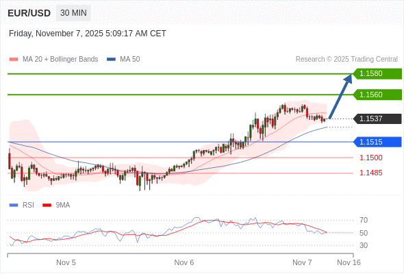 在 1.1515 之上,看涨,目标价位为 1.1560 ,然后为 1.1580 。
