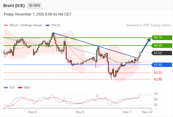 在 63.50 之上,看涨,目标价位为 64.35 ,然后为 64.70 。