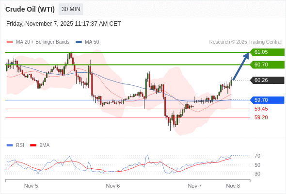 在 59.70 之上,看涨,目标价位为 60.70 ,然后为 61.05 。