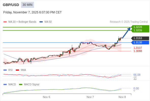 英镑/美元 当日内 : 看涨,当 1.3138 为支撑位。