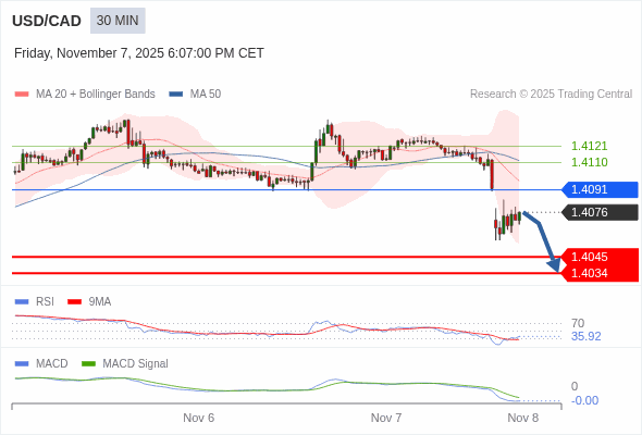 美元/加元 当日内 : 看跌,在 1.4091 之下。