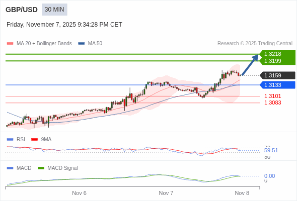 英镑/美元 当日内 : 看涨,当 1.3133 为支撑位。
