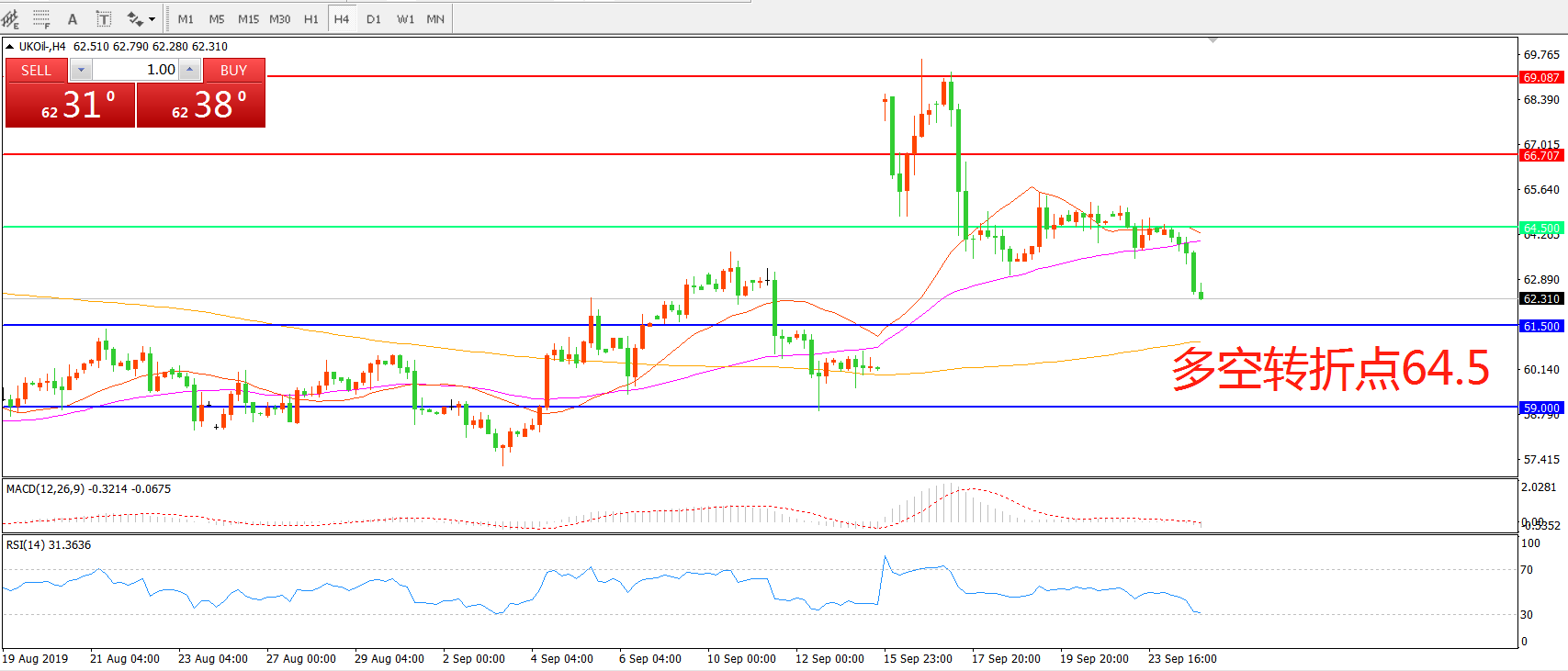 北京时间9月25日凌晨,美国石油协会(API)公布的数据显示,美国截至9月20日当周API原油库存意外增加138万桶,远高于预期,数据公布后,布油短线快速走低并最终收报62.31美元/桶。风险情绪受抑以及沙特稳步推进复产行动,令原油多头信心受挫。晚间22:30将公布EIA库存数据,务必重点关注。