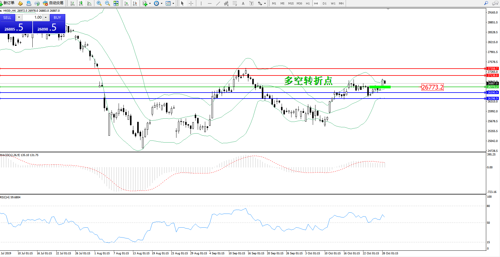 港股跟随外围造好而高开过百点后扩大升幅,恒指高见27005,曾经突破27000,但仅也是一闪即逝,再度回落、并在附近横行。中美双方就会谈问题,达成初步协议,周内聚焦在联储局减息,及多项经济数据,包括有国内生产总值 GDP 和10月份就业数据。区块链火热,而本周脱颖而出的一定会是真正的区块链概念股。未来随着第二波、第三波的炒作,随便什么公司都可能会涉及区块链。区块链可以认定是一个大主题,这个去年在民间炒作后归于平静的概念,自上峰的政策指令颁布后,又焕发了新的活力,注意这个消息是从顶层传达的,未来会层层推进,每一层推进,每一个消息,都是炒作这个概念的良机,可谓是真正的想象空间巨大。