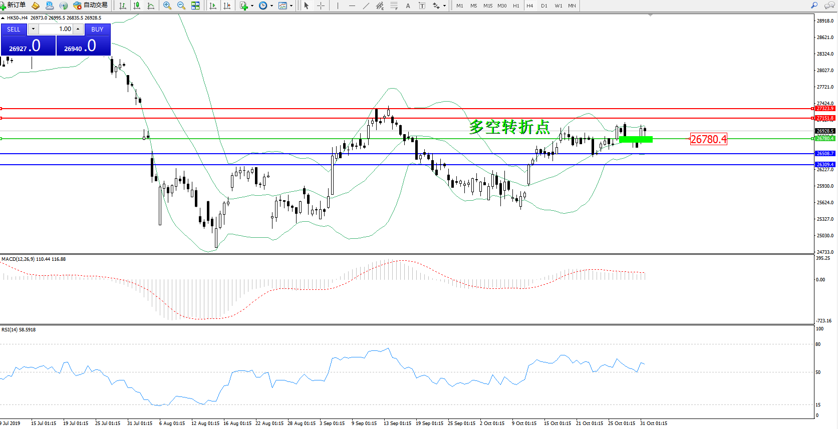 香港恒生指数10月31日(周四)收盘上涨239.01点,涨幅0.90%,报26906.72点;港股高开40点后逐步扩大升幅,主要为汇丰银行跟随下调最优惠利率八分之一厘,为近11年首次。消息刺激恒指急升,再冲上27009高位,最多升341点。随后续在高位横行。美联储隔夜年内第三次降息25基点,各国央行将迎一波降息潮,给恒指市场流动性带来正面支持。美联储降息已经不是什么大新闻了,其暗示将暂停降息,似乎也没什么新意了。