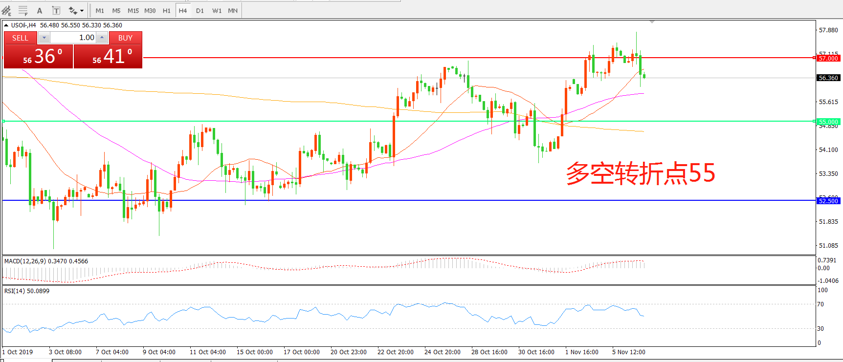 4小时图看,油价触碰57美金阻力后震荡回落,但依然处于上行趋势之中,均线系统拐头向上,MACD红柱减少,RSI指标走平,日内油价延续上行概率较大。