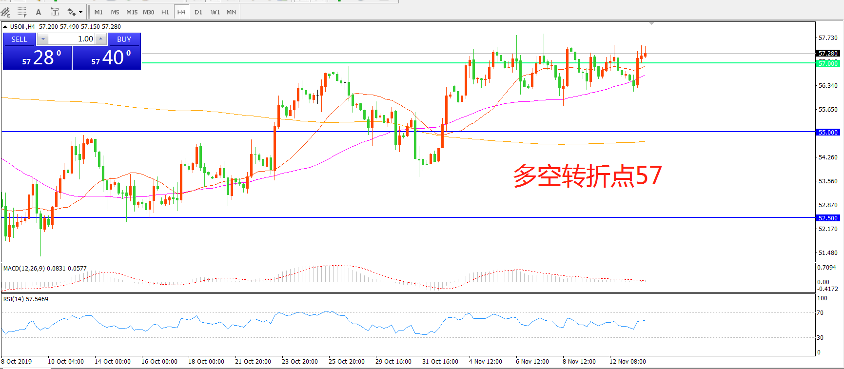 4小时图看,油价延续高位震荡,短期走势有所回暖,57美金一线暂时收复,均线系统走平,MACD红柱减少,RSI指标走平,日内延续震荡概率较大。