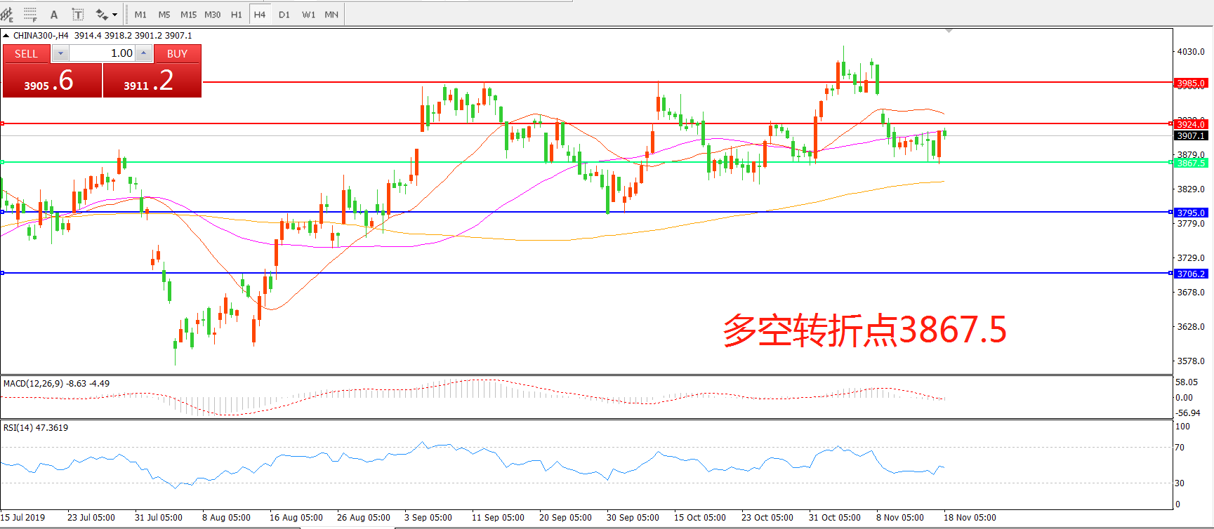 4小时图看,沪深300延续低位震荡,触碰3867.5后小幅反弹,均线系统走平,MACD红柱增加,RSI指标向下,日内如能突破3924阻力,有望迎来反弹。