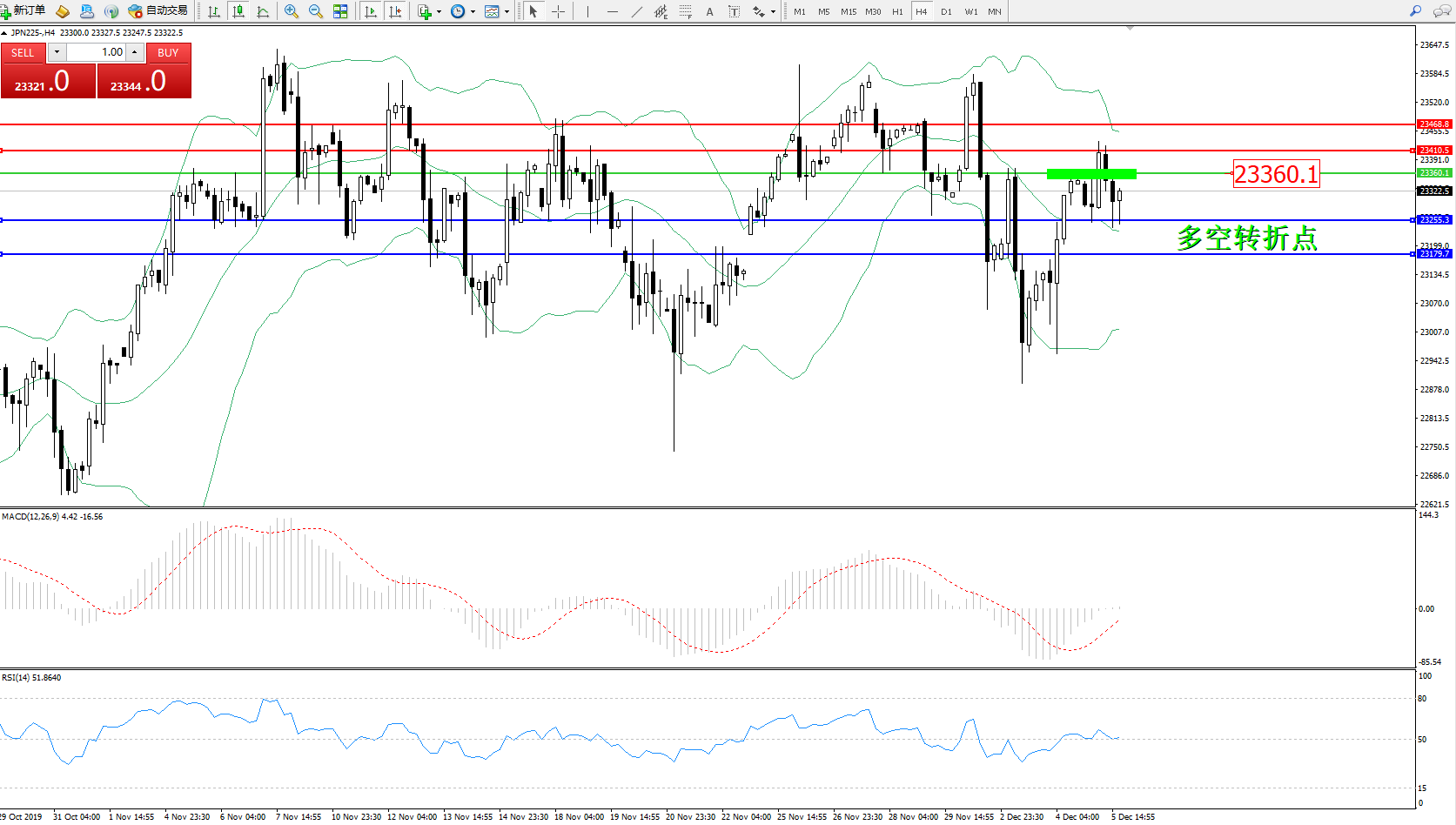 日经225指数12月5日(周四)收盘上涨168.27点,涨幅0.73%,报23303.50点。在国内经济要应对出口低迷、自然灾害以及近期消费税提高带来的影响之际,周四(12月5日)日本首相安倍晋三宣布了一项用于支持增长的刺激计划。根据草案,计划总规模约26万亿日元(2390亿美元)、横跨未来数年,其中一半约为财政措施。草案指出,这些措施将使实际增长提高约1.4个百分点。日本额外开支计划的出台,正值全世界日益意识到,全球经济放缓暴露出依赖央行来挑起经济管理重担的局限性,保持经济增长需要政府提供更多帮助。