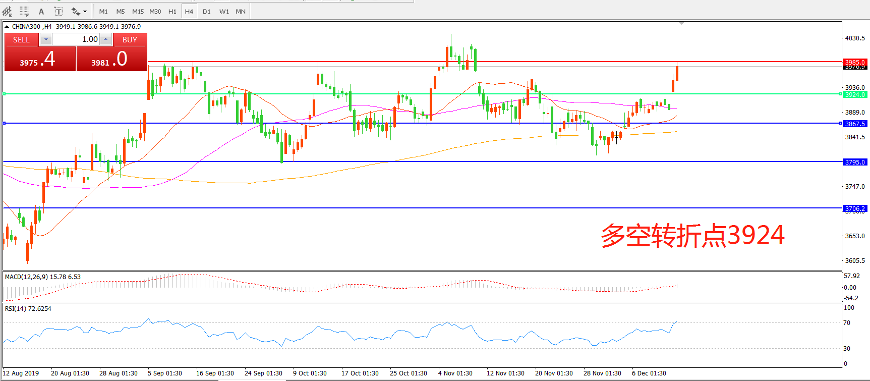 4小时图看,沪深300阳线连续拉升,整体走势偏强,均线系统走平,MACD红柱增加,RSI指标向上,日内延续上行概率较大。