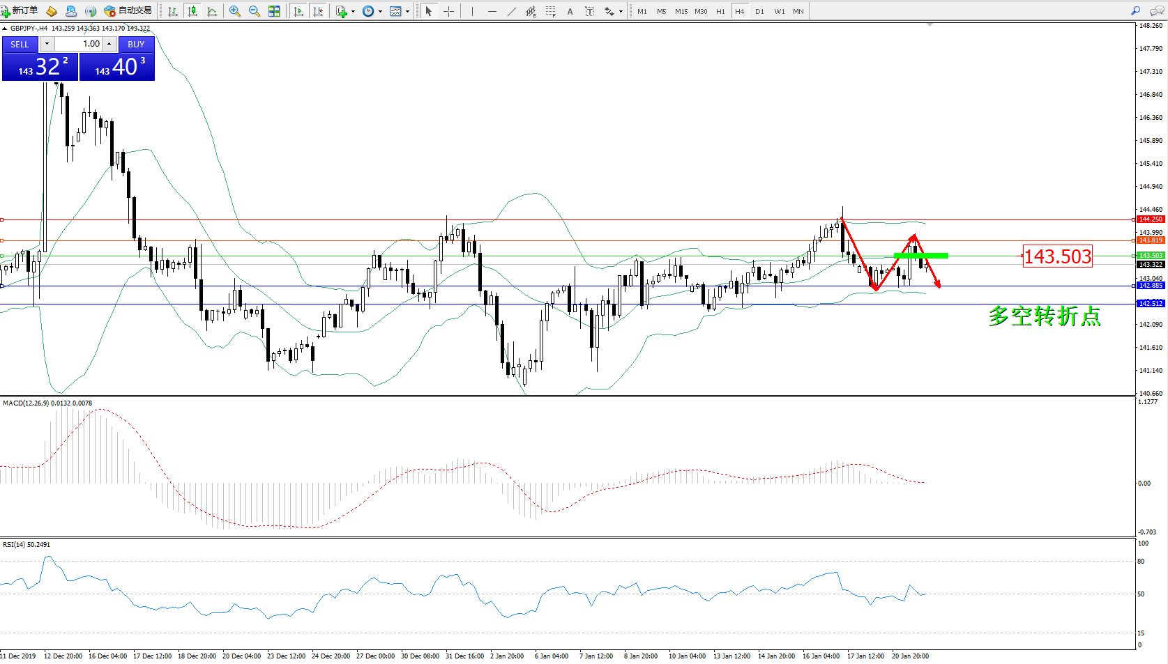 交易策略:143.503下方看跌,目标142.885142.513