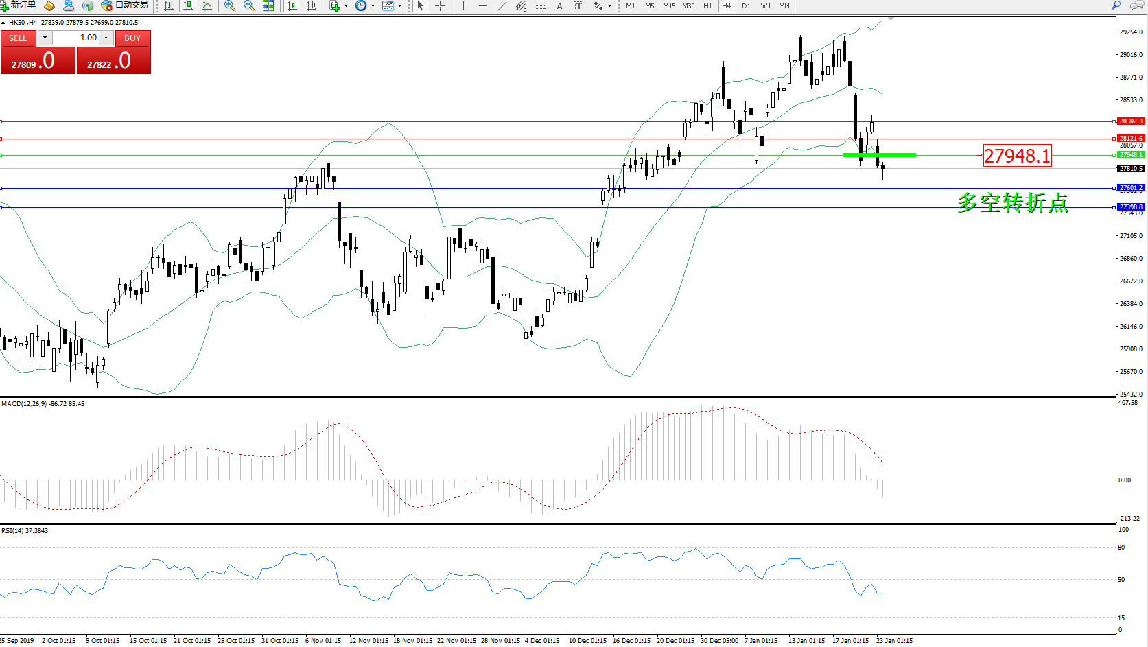 香港恒生指数123日(周四)收盘下跌431.92点,跌幅1.52%,报27909.12点;恒指跌1.52%失守28000点,港股三大指数跟随A股,地产、濠赌股领跌,在武汉肺炎疫情阴霾的笼罩下纷纷收跌。香港卫生防护中心总监黄嘉庆最新表示,香港初步确诊第2例新型肺炎。澳门确诊第二宗新型冠状病毒感染确诊病例,澳门旅游局宣布,取消所有农历新年庆祝活动,濠赌股全线大跌。提醒:明日港股上午继续开市,下午休市。