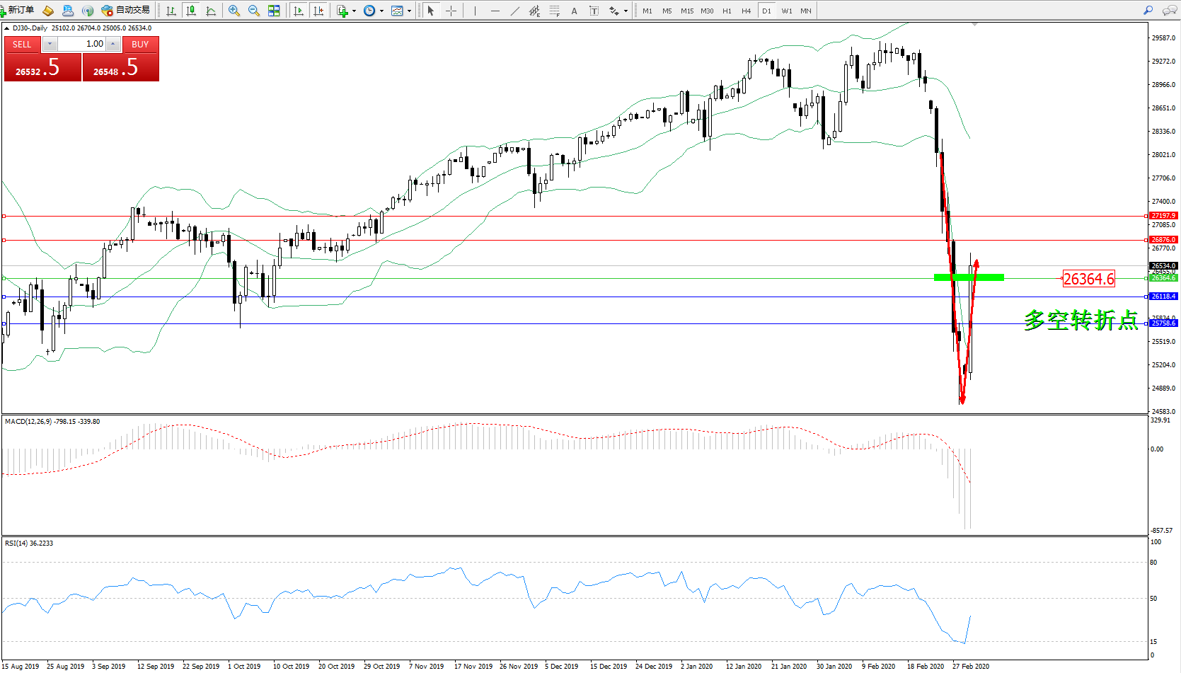 道琼斯指数32日(周一)收盘上涨1293.90点,涨幅5.09%,报26703.26点。美股周一大涨,主要股指尾盘强劲拉升,道指录得史上最大单日上涨点数,并创2009年以来最大日涨幅。市场仍在关注公共卫生事件的发展及其对全球经济的影响。市场对全球央行或将再次联手救市的预期升温。美国2月制造业活动放缓,因新订单减少,印证了对快速扩散的公共卫生事件会导致供应链中断的担忧。对美元利空的是,与其他许多央行相比,美联储在政策上有更大的空间,这些举措可能会对美元的吸引力造成实质性损害。