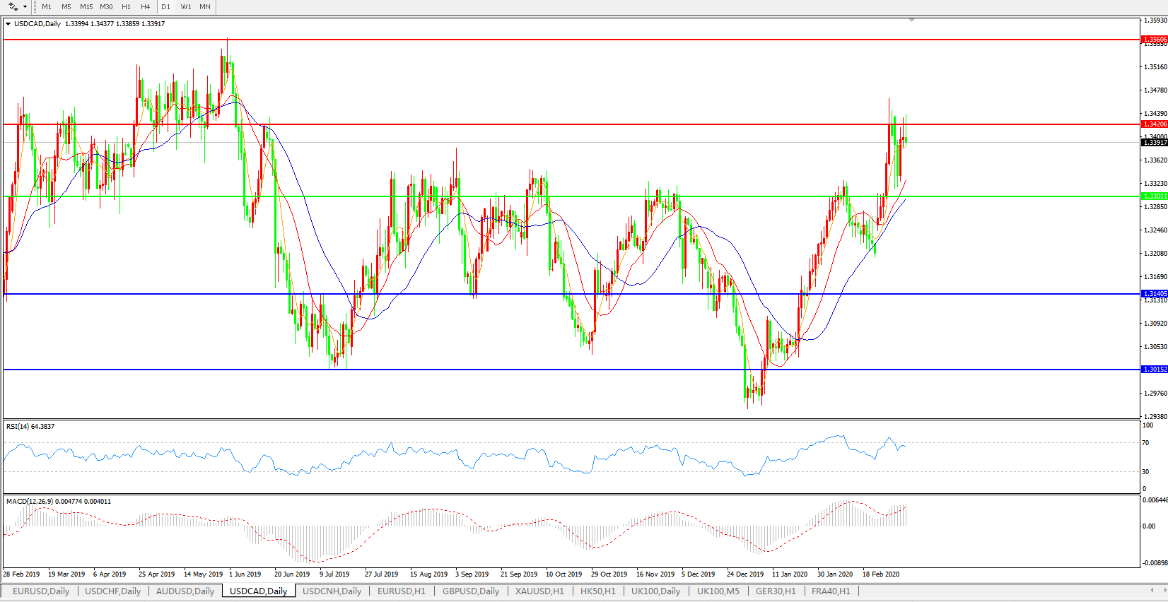 美元兑加元在周四延续隔夜以来强势逐波上行,欧市午盘之后涨幅加速,升至日高1.3424,距隔夜加拿大央行降息后的反应高点仅一步之遥。日内,全球风险偏好情绪再度降温,对商品系货币继续构成压力,而原油价格在尽管OPEC达成减产新协议的背景下仍维持下行趋势,这让加元汇价承受了额外压力; 分析人士因而指出,在加拿大央行被迫跟随美联储降息后,加元汇价后市将在全球基本面恶化的环境下面临更大的压力。此前已有机构测算出,2020年全年全球市场将损失30万桶/日的原油有效需求,这对于与油价关联密切的加元也将构成持续压力。市场目标正转向此后周五公布的美加两国就业数据报告,这可能推动美元兑加元进一步上行挑战1.35高位阻力
