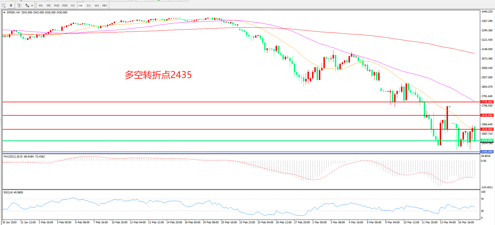 4小时图看,标普500维持低位震荡,整体走势有回暖迹象,均线系统呈空头排列,MACD绿柱增加,RSI指标走平,日内延续震荡概率较大。